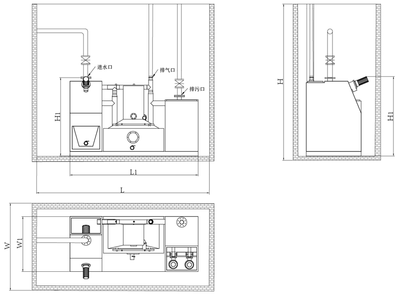 1.設備采用地下式安裝時,要求地面保持水平; 2.設備的底座基礎要求用地腳螺栓進行固定; 3.設備的進出水口應安裝閘閥,以便設備調試與檢修; 4.設備通氣管應連接到室外或與建筑物排水系統(tǒng)通氣管連接; 5.設備旁邊應設有排水溝,便于維修排水、緊急事故排水以及設備的溢流排水; 6.設備采用坑式安裝時,需預設預留坑。預留坑的尺寸請參見設備安裝尺寸表,要求坑內地面平整; 7.設備安裝預留坑上部蓋板要求方便打開。人孔和爬梯設置應方便日常提桶; 8.設備檢修時,打開人孔蓋板通氣半小時后,方可對其操作; 9.坑內應設有500*500*500mm排水坑,安裝輔泵,以便設備的維修; 10.其他方面請參照土建、結構、設備安裝等相應規(guī)范要求。