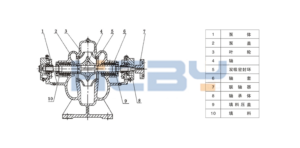本型泵的吸入口與吐出口均在水泵軸心線的下方,與軸線垂直成水平方向。檢修時(shí)無(wú)需拆卸進(jìn)出口水管及電機(jī)。從傳動(dòng)方向看去,水泵為順時(shí)針?lè)较蛐D(zhuǎn)(根據(jù)用戶需要亦可改為逆時(shí)針?lè)较蛐D(zhuǎn))。 泵主要零件有:泵體、泵蓋、葉輪、軸、雙吸密封環(huán)、軸套等。 泵體與泵蓋構(gòu)成葉輪的工作室。在進(jìn)出水法蘭上,制有安裝真空表和壓力表的管螺孔。進(jìn)出水法蘭的下部,制有放水的管螺孔。 經(jīng)過(guò)靜平衡校驗(yàn)的葉輪,用軸套和兩邊的軸套螺母固定在軸上,其軸向位置可通過(guò)軸套螺母進(jìn)行調(diào)整。 泵軸由兩個(gè)單列向心球軸承支承。軸承裝在軸承體內(nèi)、安裝在泵體兩端,用黃油潤(rùn)滑。 雙吸密封環(huán)用以減少水泵壓水室的水漏回吸水室。 泵通過(guò)彈性聯(lián)軸器由電動(dòng)機(jī)直接傳動(dòng),必要時(shí)亦可用內(nèi)燃機(jī)傳動(dòng)。 軸封為軟填料密封(根據(jù)用戶需要可采用機(jī)械密封結(jié)構(gòu))。 結(jié)構(gòu)特點(diǎn) 1. 結(jié)構(gòu)緊湊 外形美觀,穩(wěn)定性好,便于安裝。 2. 運(yùn)行平穩(wěn) 優(yōu)化設(shè)計(jì)的雙吸葉輪使軸向力減小到**限度,且有優(yōu)異水力性能的葉型,并經(jīng)精密鑄造,泵殼內(nèi)表面及葉輪表面極其光華具有顯著的抗汽蝕性能和高效率。 3. 軸 承 選用SKF及NSK軸承保證運(yùn)行平穩(wěn),噪音低,使用壽命長(zhǎng)。 4. 軸 封 選用BURGMANN機(jī)械密封或填料密封。能保證8000小時(shí)運(yùn)行無(wú)泄漏。 5. 安裝形式 裝配時(shí)不需調(diào)整,可根據(jù)現(xiàn)場(chǎng)使用條件。分立式或臥式安裝。 6. 加裝自吸裝置,可實(shí)現(xiàn)自動(dòng)吸水,即不需安裝底閥,不需真空泵,不需倒灌,泵可以啟動(dòng)。